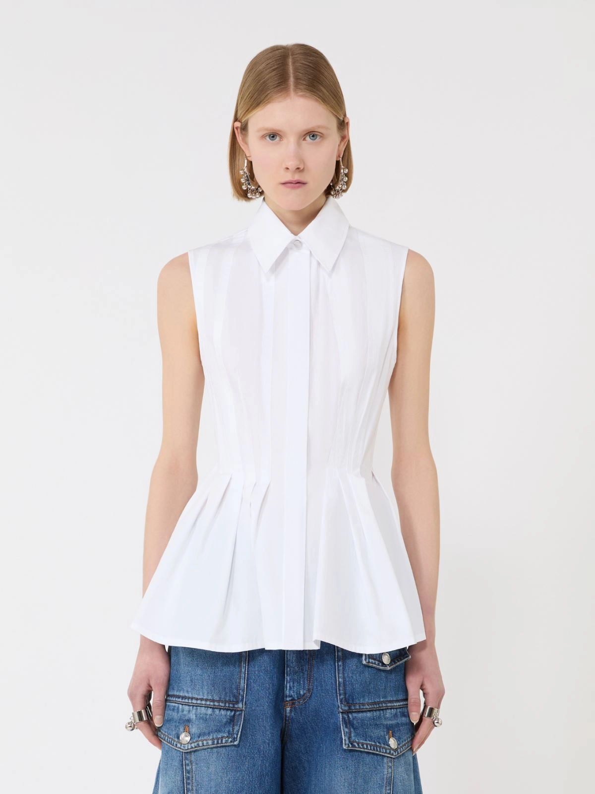 不規則なダーツとタックディテールが特徴的なピュアコットンシャツ。