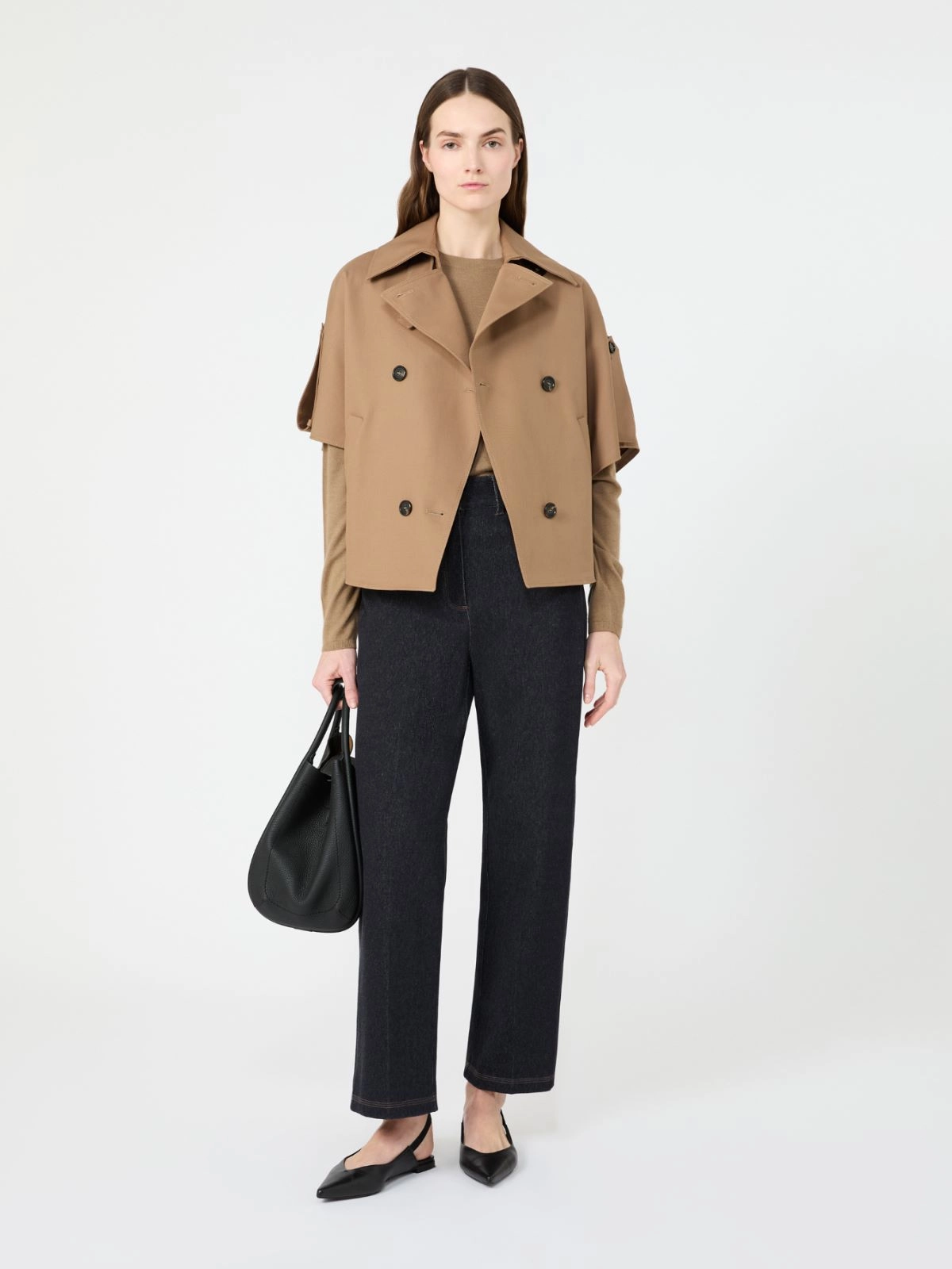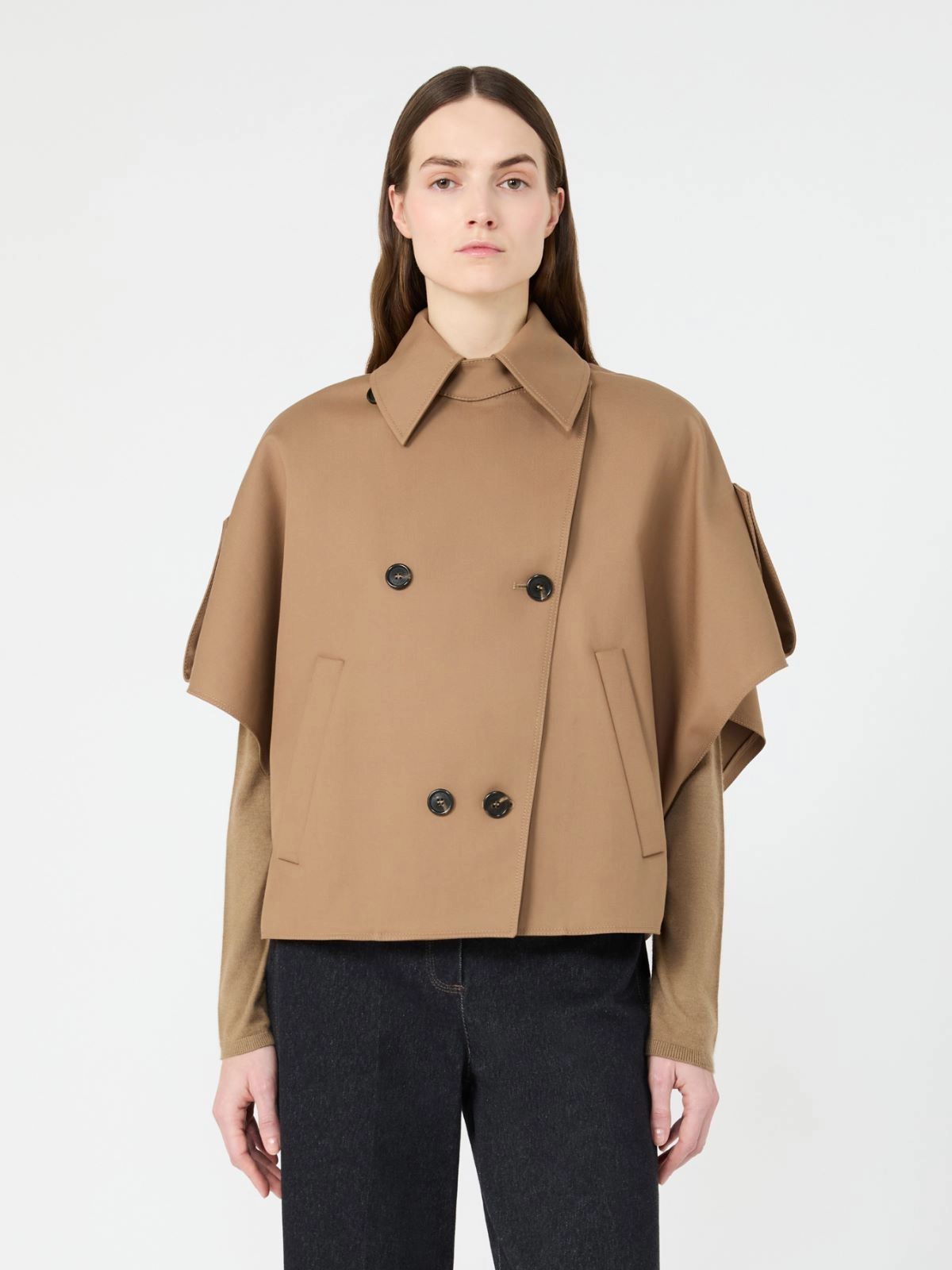 トレンチコート風のディテールがあしらわれたピュアコットンケープ。
