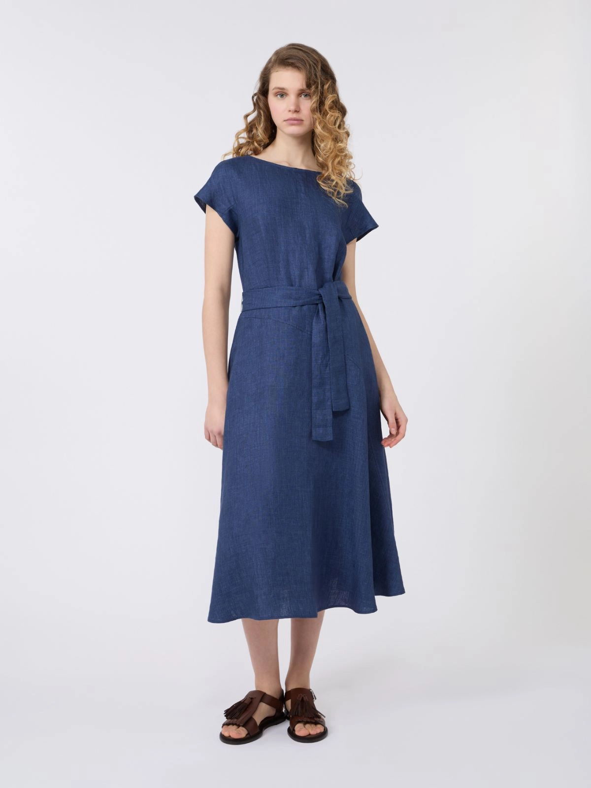フロントにあしらわれたアシンメトリーな縫い目のモチーフが特徴的なリネンキャンバスのドレス。上質なリネンならではの清涼感のある軽やかな素材感でサマーシーズンにも快適にお召しいただけます。シルエットはボートネックのフレアラインのミディ丈。共布ベルトでウエストをシェイプしたフェミニンな着こなしもおすすめです。