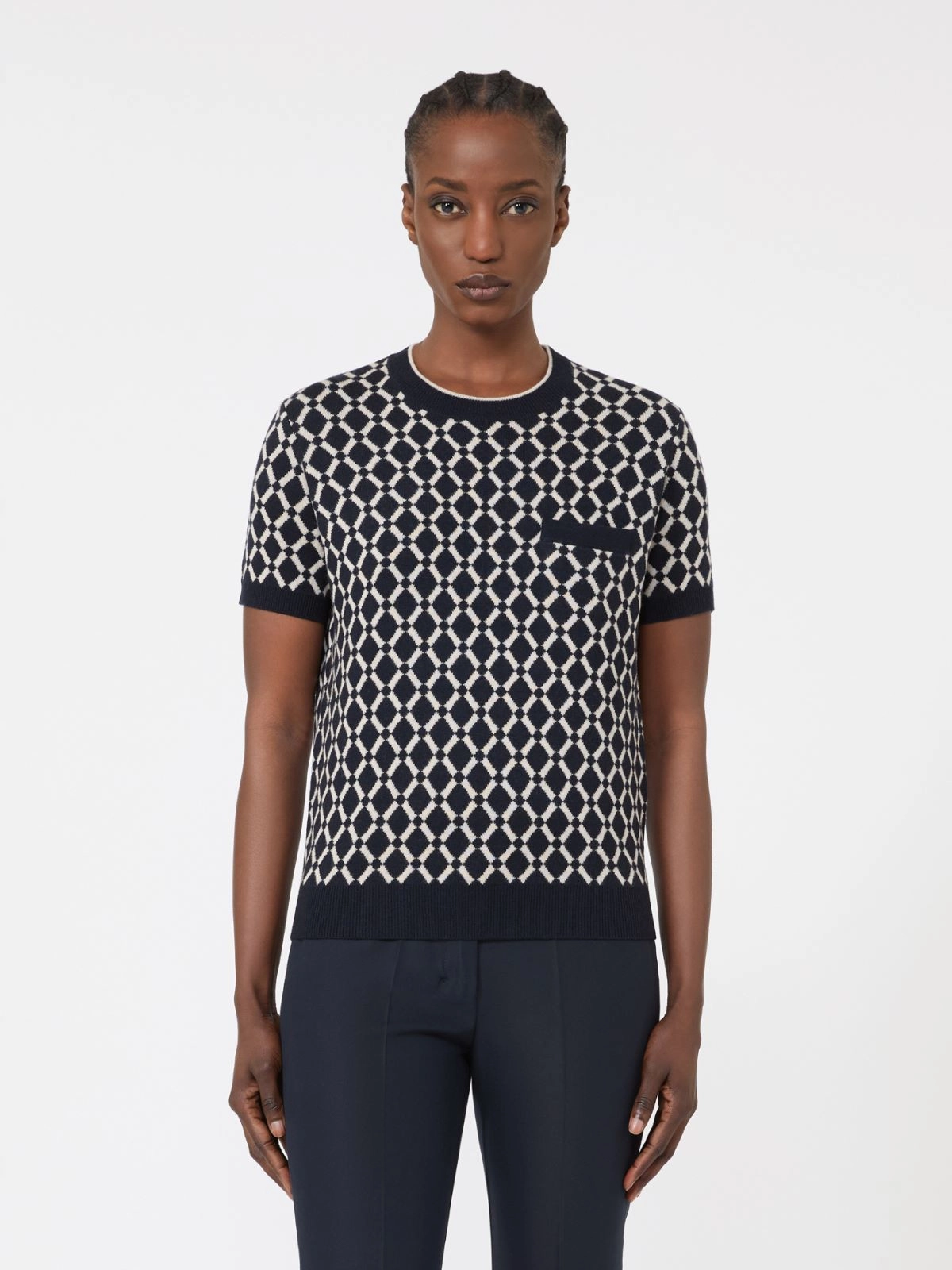 ジャカード織りの幾何学模様があしらわれたピュアウールのニット。